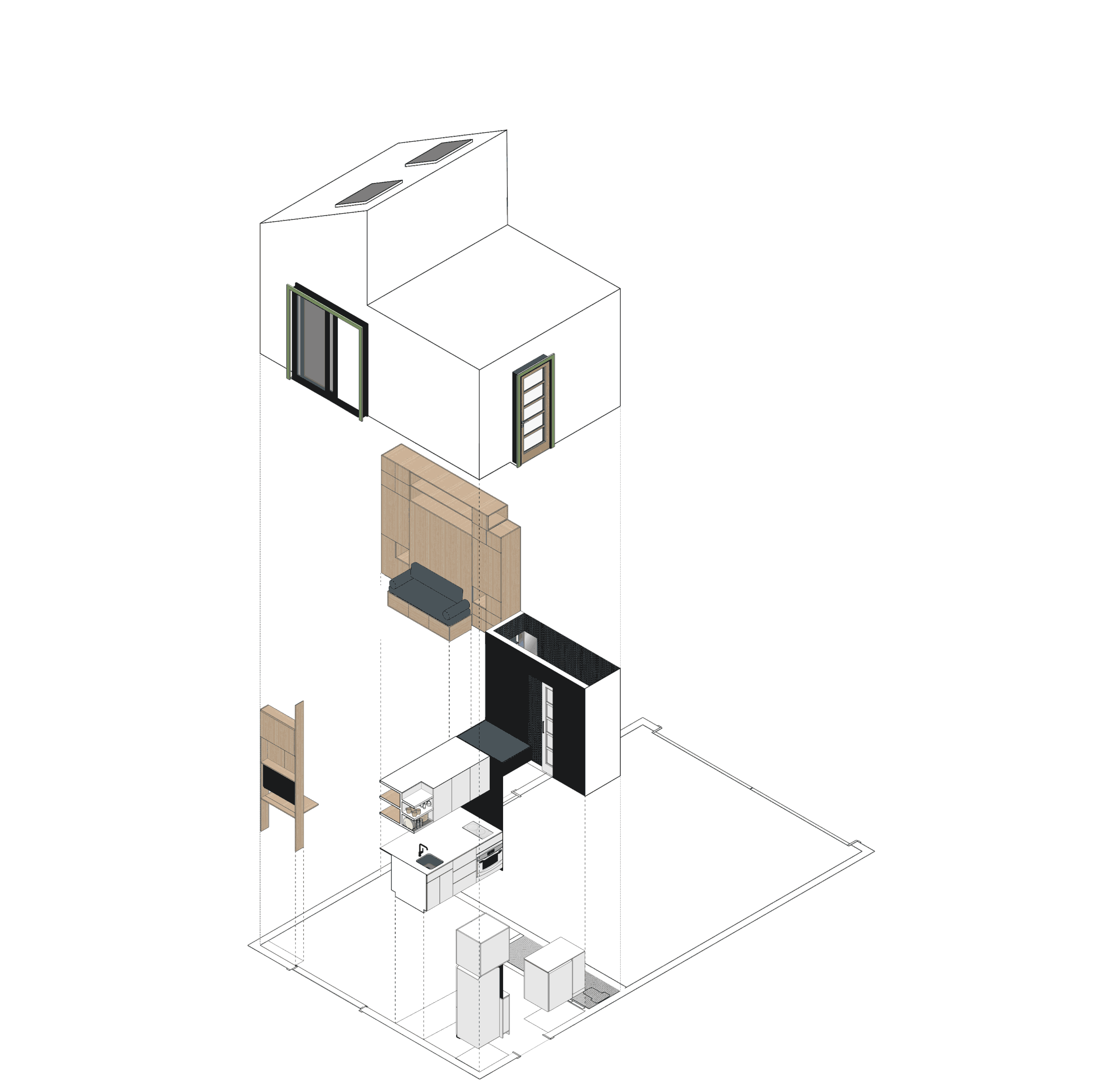 With the dwelling area just 225ft² (21m²), we had to establish the essential areas: Kitchen, Living, and Bathroom. We knew that the kitchen was going to be the hearth of the space, so everything revolved around an open kitchen concept which then becomes a serving area into the living space. There is ample storage space on both sides of the kitchen.